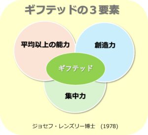 教育学者ジョセフ・レンズーリは、ギフテッドの特徴を「高い能力」「創造性」「課題への強いコミットメント(探究心)」という三つの要素の重なりとして説明しました。